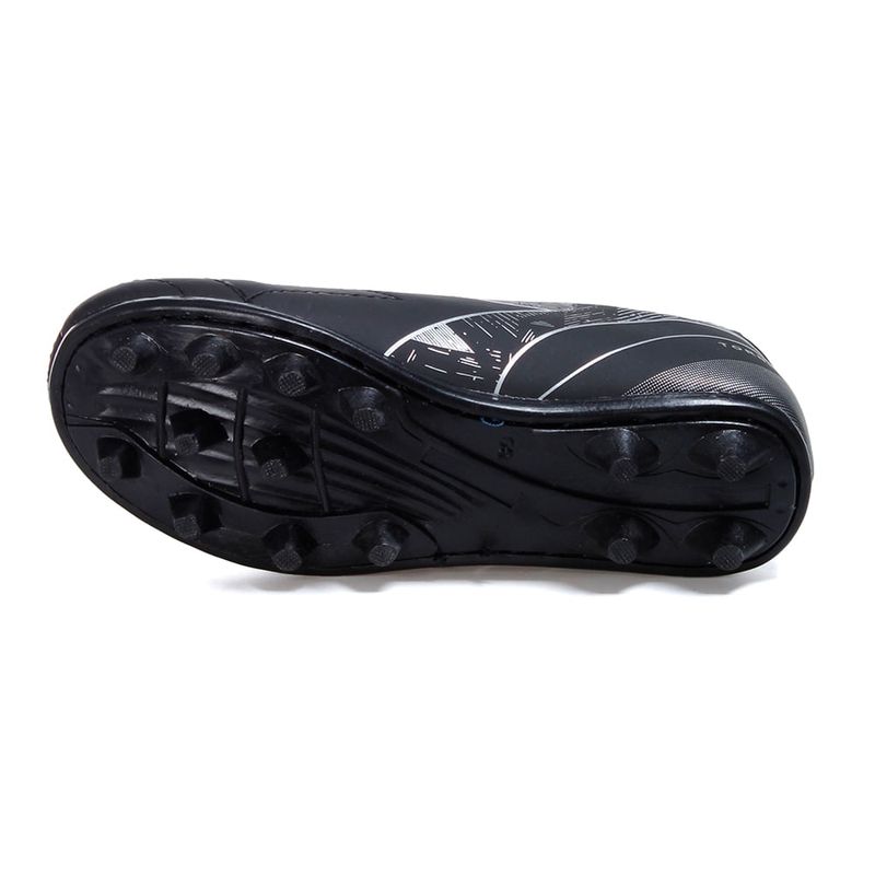 Fabricada com cabedal em material sintético de alta durabilidade, a chuteira possui forro em tecido respirável, palmilha em EVA que oferece amortecimento e solado em PVC com travas que garante firmeza no gramado natural.