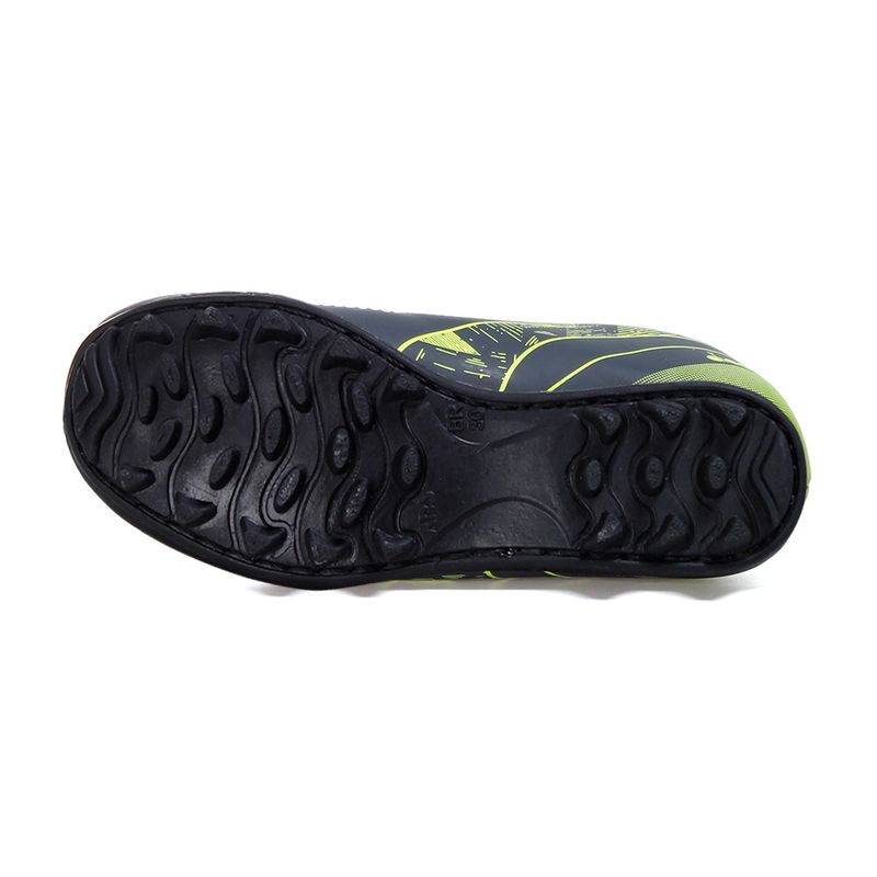 Confeccionada em material sintético resistente, a chuteira oferece maior durabilidade. O forro em tecido auxilia na ventilação, enquanto a palmilha em EVA garante amortecimento e conforto. Já o solado de borracha proporciona tração e segurança nos movimentos.